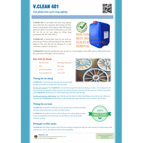 V.Clean 401 là chế phẩm làm sạch công nghiệp, được phối trộn theo công thức định hướng của Nitto Denko, ứng dụng làm sạch màng lọc thẩm thấu ngược (RO). Sản phẩm có hoạt tính và hiệu quả cao, an toàn đối với tất cả các loại màng lọc thông dụng (polyamide, PP, PVC, PES, PAN...)